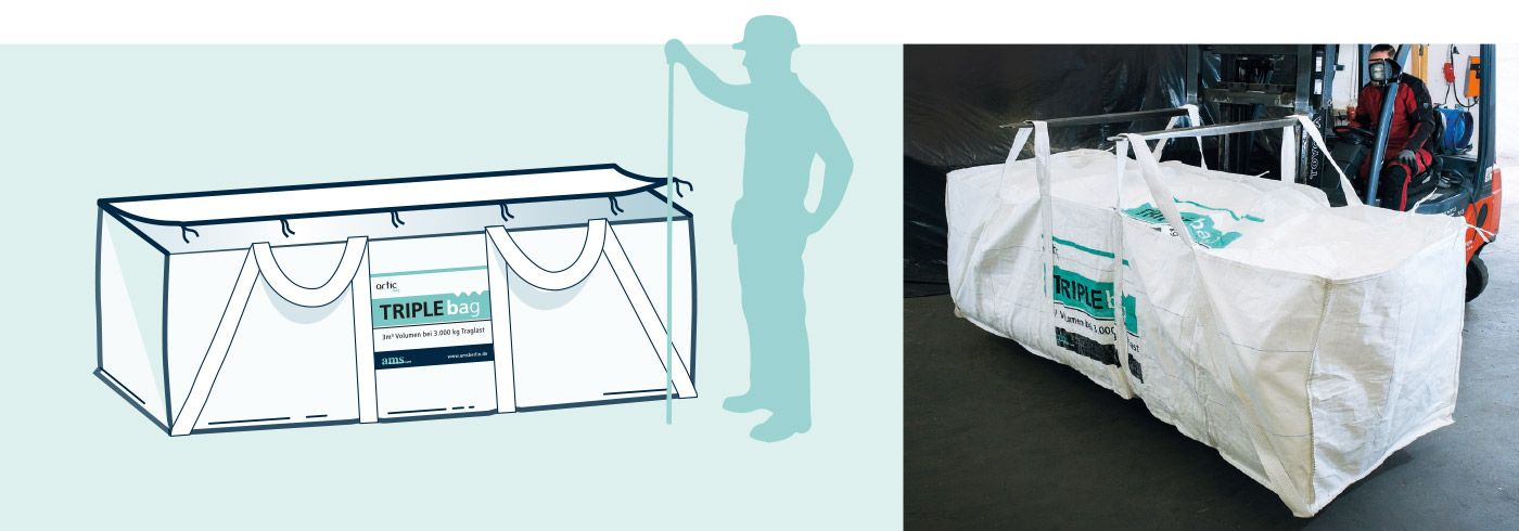 With the new TRIPLE bag you can dispose THREE times as much bulk material and bulky items in one go and save money on handling and logistics! Our innovative artic TRIPLE bag is tested and certified. It combines the volume and load capacity of THREE big bags!