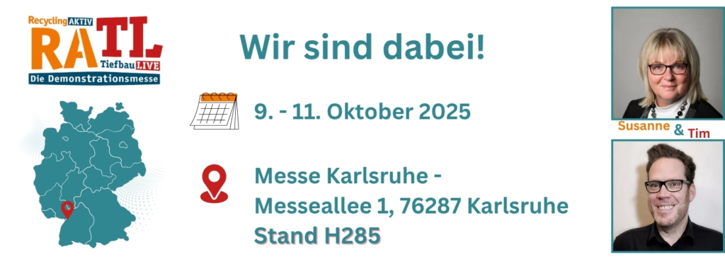 Vom 9. bis 11. Oktober 2025 findet in Karlsruhe die RecyclingAKTIV & TiefbauLIVE (RATL) statt – die Fachmesse für Bau, Abbruch und Recycling. Tim Hasekamp und Susanne Bischoff-Hennes freuen sich, euch vor Ort zu treffen. Ihr findet uns an Stand H285, direkt gegenüber des Eingangs zu Halle 3.